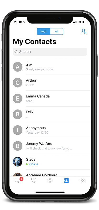 Registering with Kedr is simple and anonymous. You just select a username and a password. Sharing your telephone number and access to your phone book is voluntarily for your comfort.